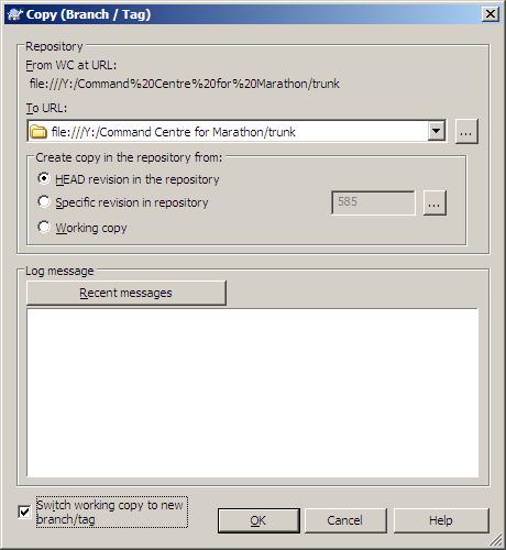 This will create the new branch 1.1. Supposing you have not yet adopted the standard trunk/branches/tags file structure as recommended by the SVN community, and all your files are currently located in the main project directory.  Switching to a trunk directory as a means of keeping your most up-to-date stable release is also straightforward.  Simply do a right-click -> branch/tag as before but this time time be sure to include “/trunk” after the main directory AND… be sure to set the checkbox “Switch working copy to new branch/tag”:
